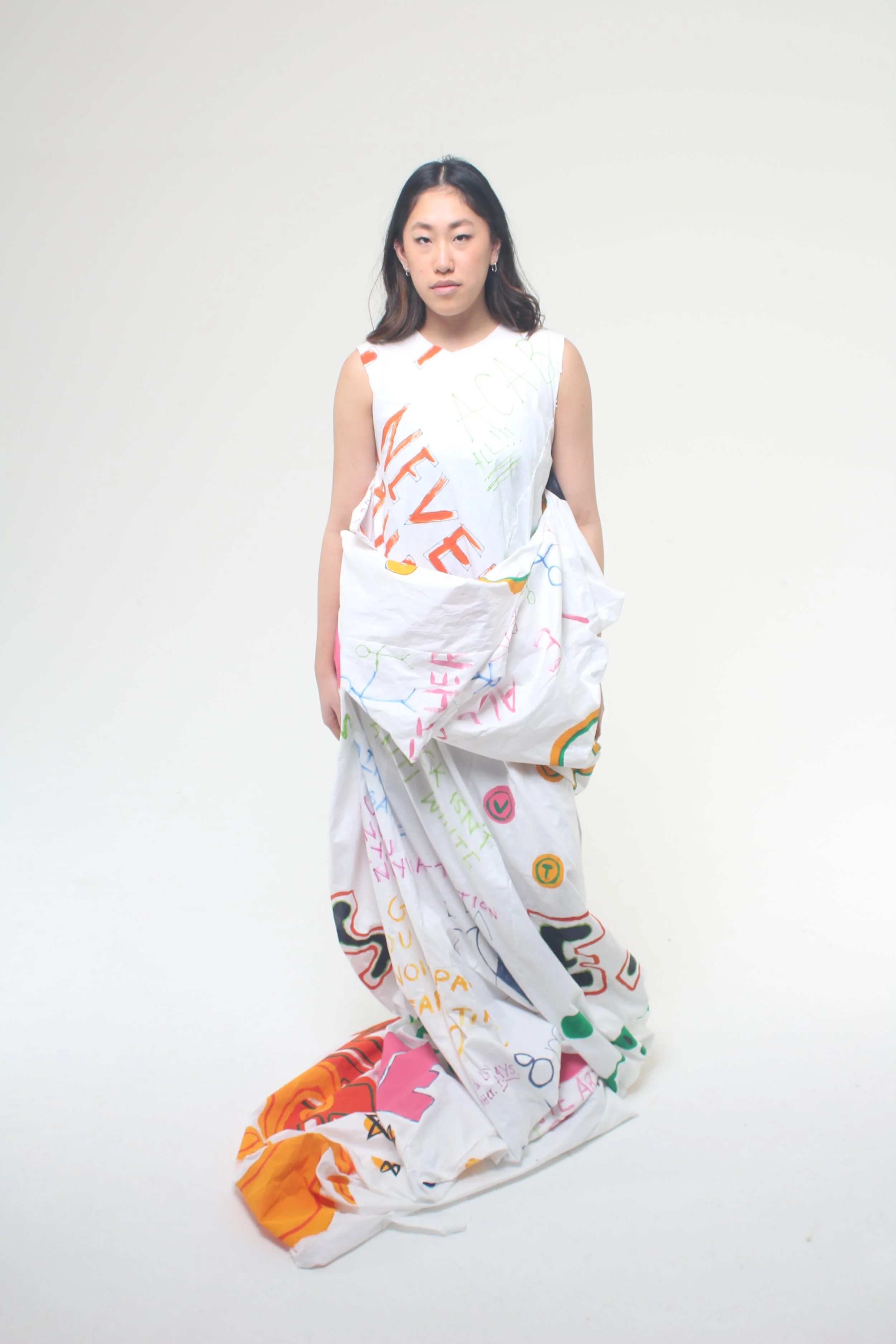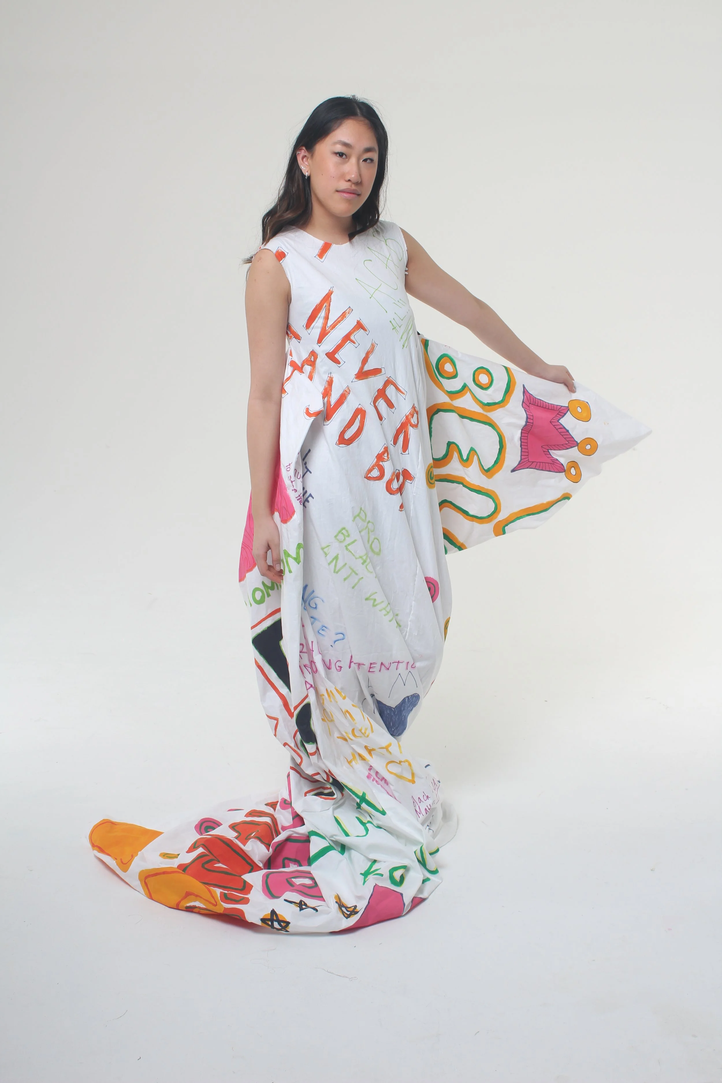 This project explored the lack of diversity within the fashion industry, from designers to models. As a child who felt like she never saw herself in this sector, I wanted to emphasise the beauty of many. I designed garments that were fluid and timeless, along with the words that so many of us who felt abandoned and forgotten in the industry.